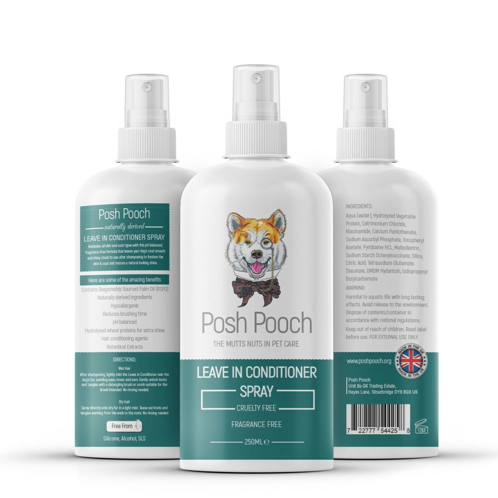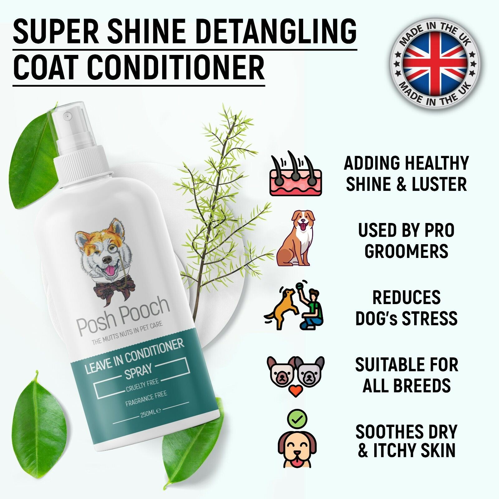 Posh Pooch Leave in Conditioner in which is a 2 in 1 formula that not only leaves your pooches coat soft , shiny and revitalised but also removes knots and matted hair and reduces brushing time