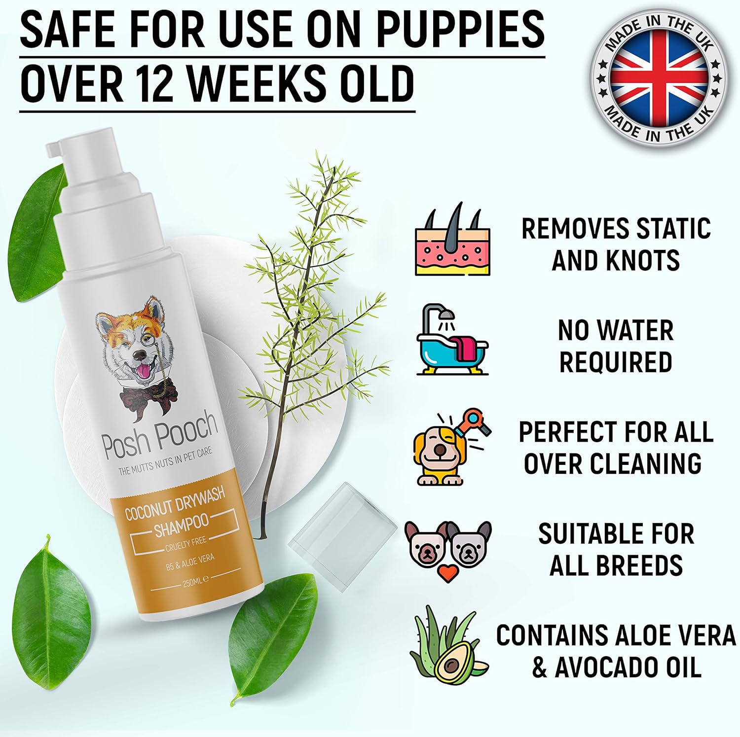 - 250ml Natural Coconut Fragrance Drywash Shampoo For Dogs & Puppies, Refresh a dogs coat in a fraction of the time with a drywash rinse free shampoo, A gentle but effective cleanse combined with conditioning agents to help reduce static and untangle knots, A perfect product for all over cleaning or to remove dirty patches, Enriched with avocado oil, a rich source of Vitamin D and E.