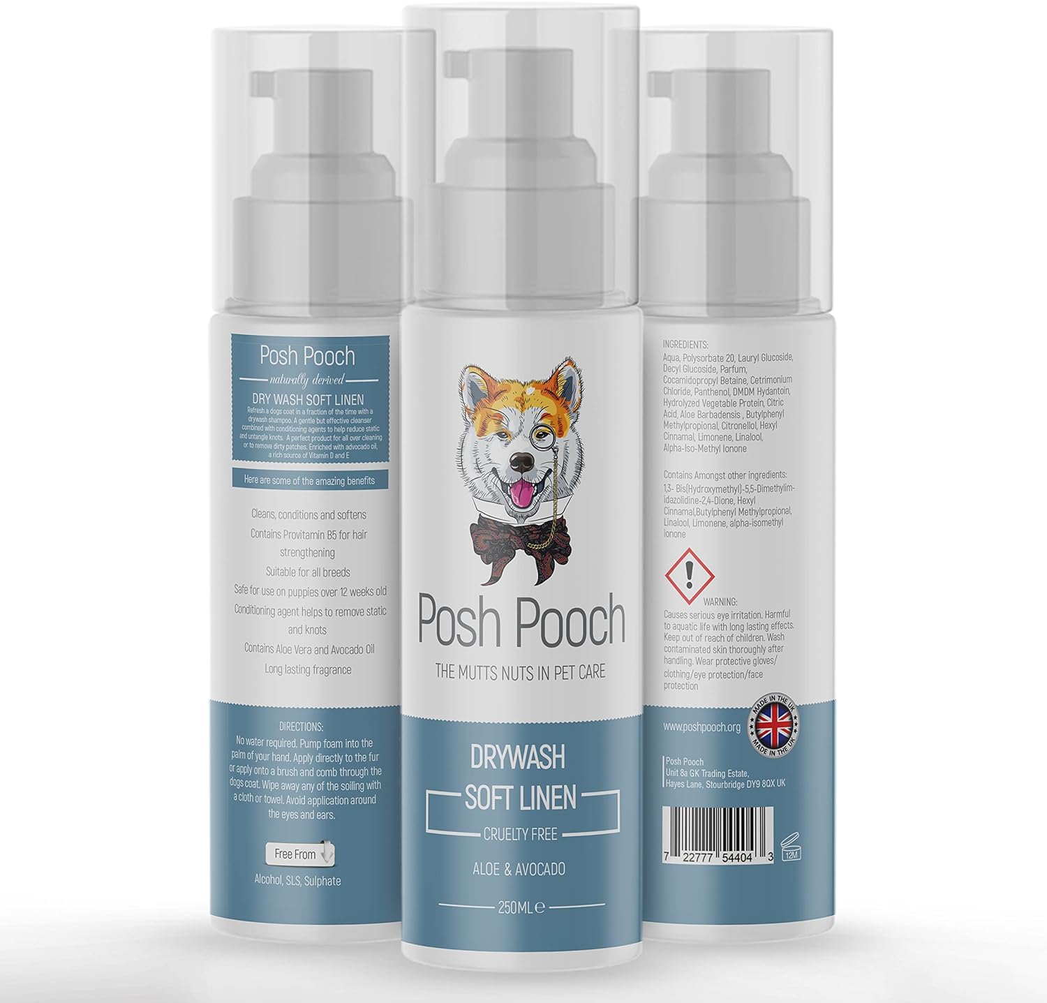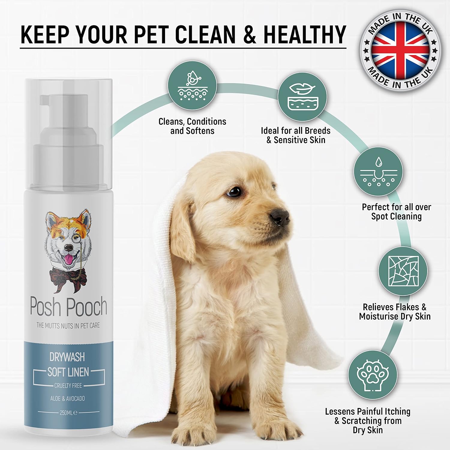 - 250ml Natural Soft Linen Fragrance Drywash Shampoo For Dogs & Puppies, Refresh a dogs coat in a fraction of the time with a drywash rinse free shampoo, A gentle but effective cleanse combined with conditioning agents to help reduce static and untangle knots, A perfect product for all over cleaning or to remove dirty patches, Enriched with avocado oil, a rich source of Vitamin D and E.