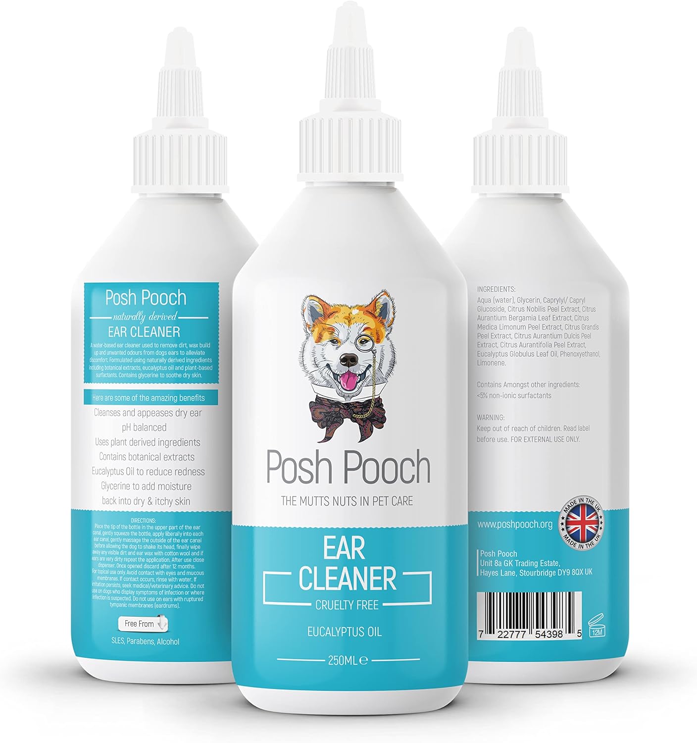 - 250ml water-based ear cleaner used to remove dirt, wax build up and unwanted odours from dogs ears to alleviate discomfort. Formulated using naturally derived ingredients including botanical extracts, eucalyptus oil and plant-based surfactants. Contains glycerine to soothe dry skin. - The infused glycerine will moisturise there ears prevent them from becoming dry & itchy,