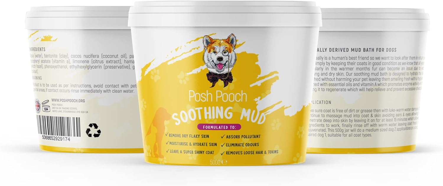 Proudly Made In The UK with full ingredients transparency Ensure your Posh Pooch is getting the care it deserves by using quality, British made products formulated in the best controlled and regulated facilities! 500g Soothing Mud For Dogs - This newly formulated natural clay mud is packed with infused B3,B5 Vitamins